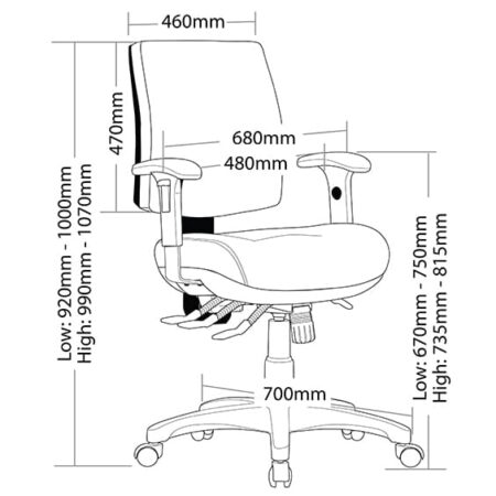 Features: Adjustable seat height Adjustable back height (ratchet) Adjustable seat and back angle Moulded seat and back foam, Square seat