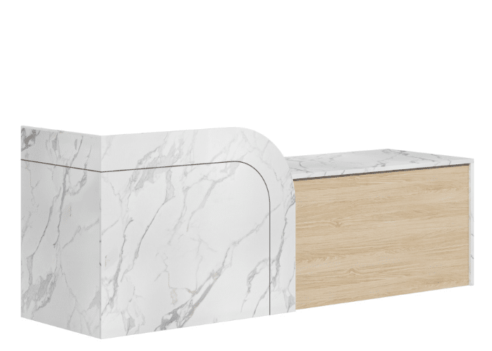 The Vienna Reception Desk, is beautifully designed with a curved privacy panel that seamlessly blends with the accompanying groove line. The desk itself boasts an elegant two-tone finish, adding a touch of sophistication to the overall aesthetic.