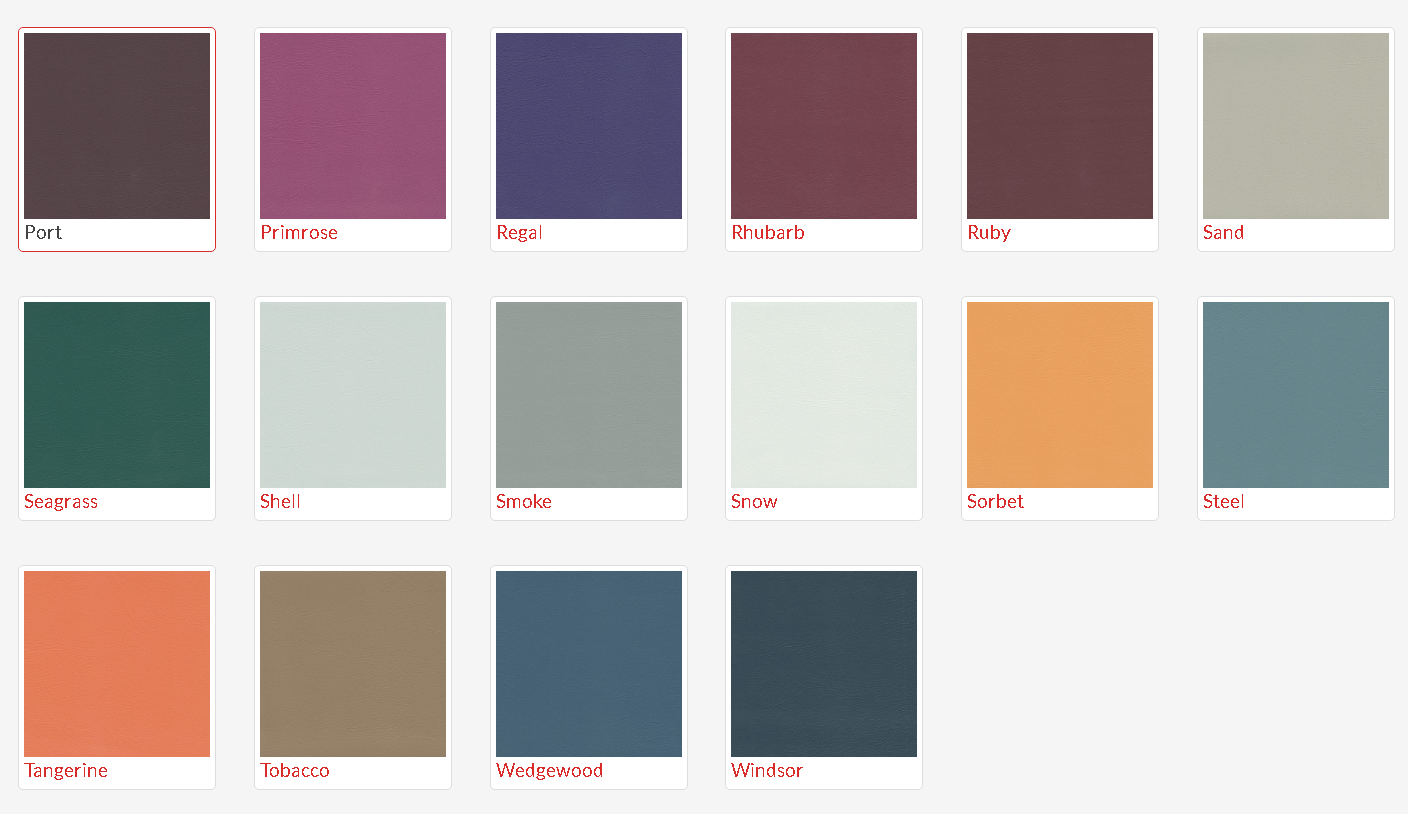 • Available Options: House Fabric, Think Plus Fabric, Pacifica Standard Vinyl and Studio Encore Vinyl. Refer to the colour swatch.